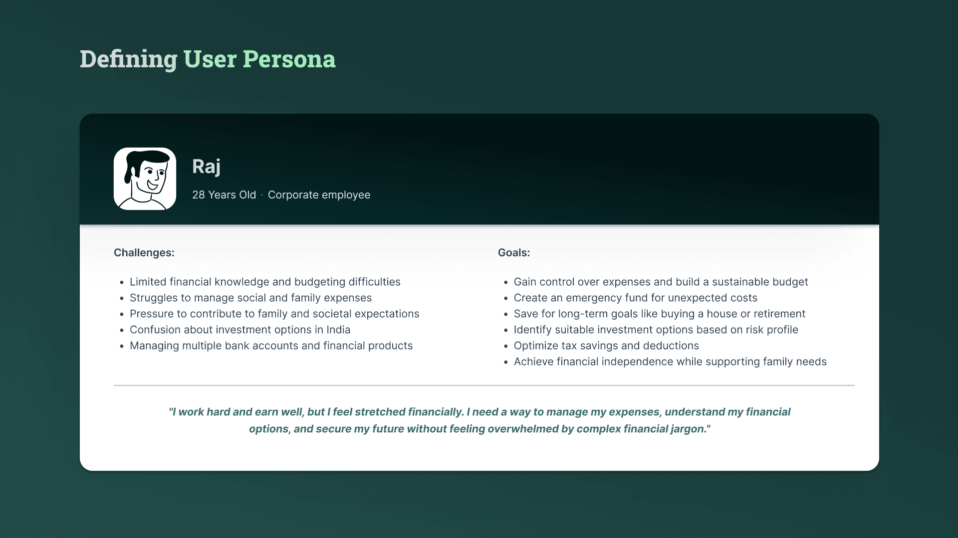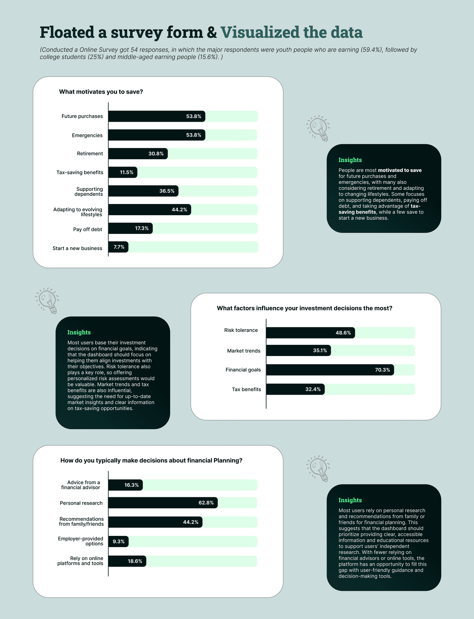Most people do not consult financial advisors and consider themselves beginners in financial knowledge. This suggests a lack of confidence in managing finances independently. Their interest in learning more about *investing*, *tax saving*, and *budgeting* highlights key areas where they seek guidance, while *goal planning* like retirement is also a priority for some. This points to a need for accessible, educational resources in these areas.