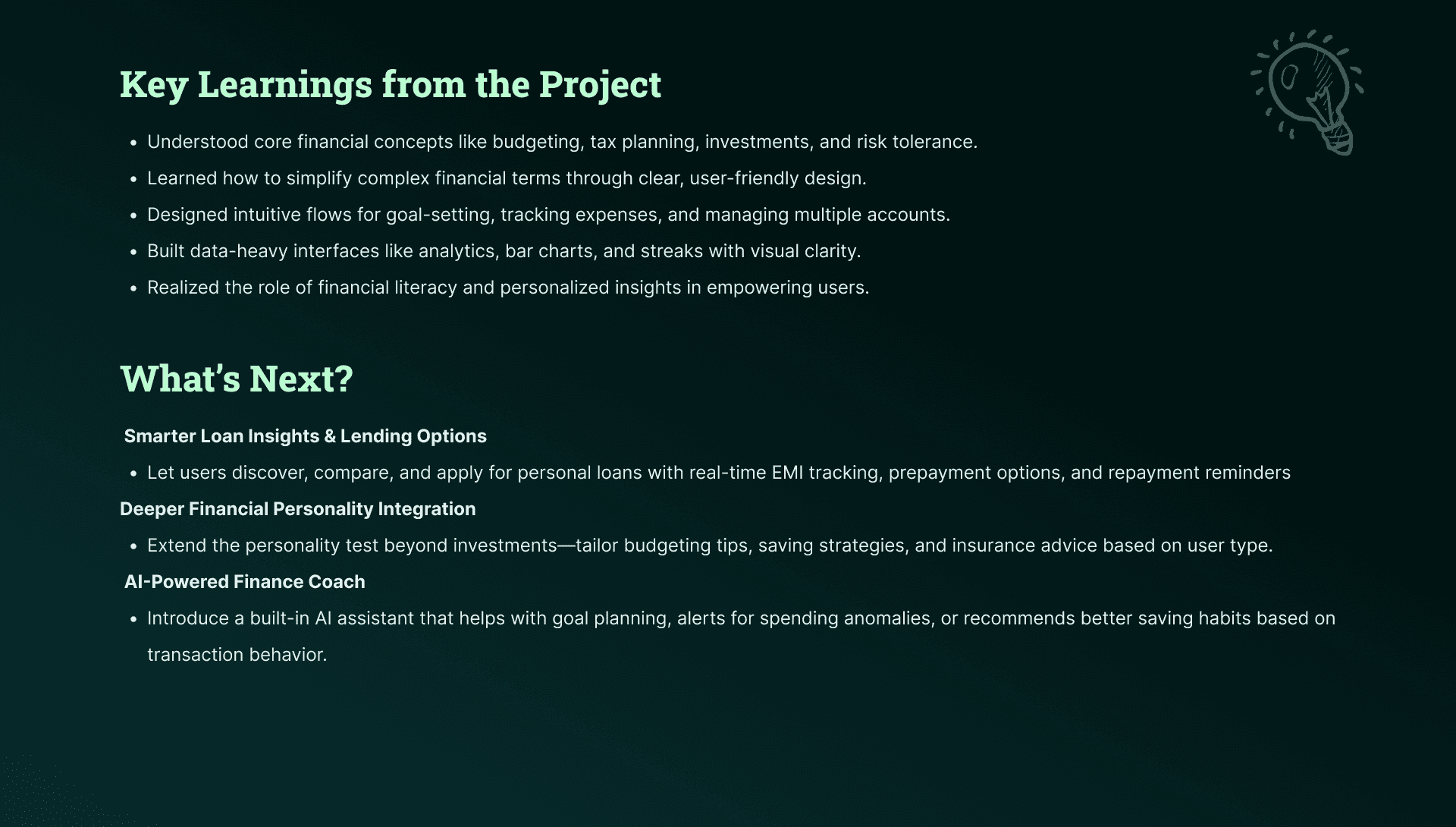 2. Personalized Recommendations: Offer tailored savings and investment advice based on goals and spending habits.